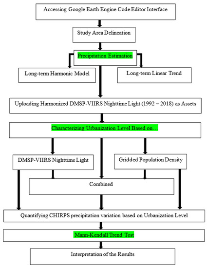 Workflow for the analysis of spatio-temporal responses of precipitation to urbanization with Google Earth Engine. This workflow illustrated how the research will be conducted by following specific sequential steps. The green-colored boxes refer to the three major steps of this research work.
