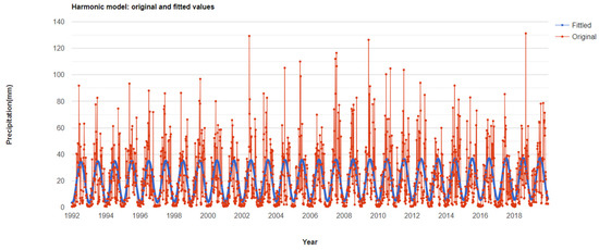 At the beginning of the analysis, the considered study area extent is specified using bounding-box coordinates in the GEE code editor interface. A harmonic model-based precipitation estimation based on daily precipitation for 27 years (from 1992 to 2018) using the CHIRPS precipitation data revealed that the long-term pattern has an upward trend (Figure 3). Harmonic analysis is suitable for describing and analyzing periodically recurrent phenomena. In fact, this approach is very conducive to reducing complex problems into manageable terms. This entails breaking complicated mathematical curves into sums of comparatively simple components [38]. Researchers have successfully used harmonic analysis for long-term trend analysis [39,40].