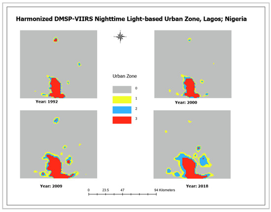 Based on the DN thresholds, four different zones are defined—Zone 0, Zone 1, Zone 2, and Zone 3—and refer to non-urbanized, low-urbanized, mid-urbanized, and high-urbanized areas, respectively.