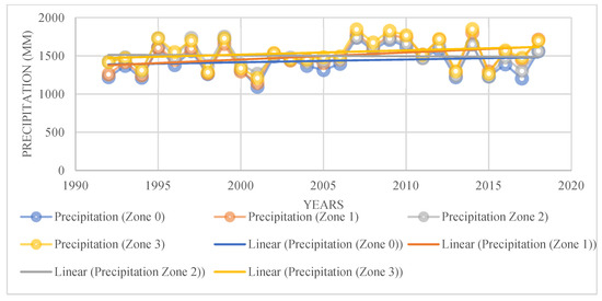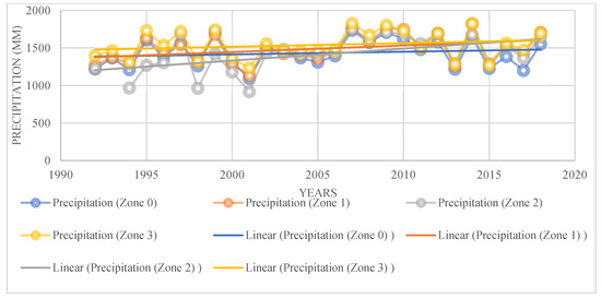 When the plotted precipitation amount was based on the combined criteria, a different kind of pattern emerged (Figure 10). This time, Zone 0, Zone 1, and Zone 3 have increasing patterns, but the rate of the precipitation increase was higher in Zone 1 as evidenced by a steeper slope (Table 10). However, surprisingly, Zone 2 showed a decreasing precipitation rate.