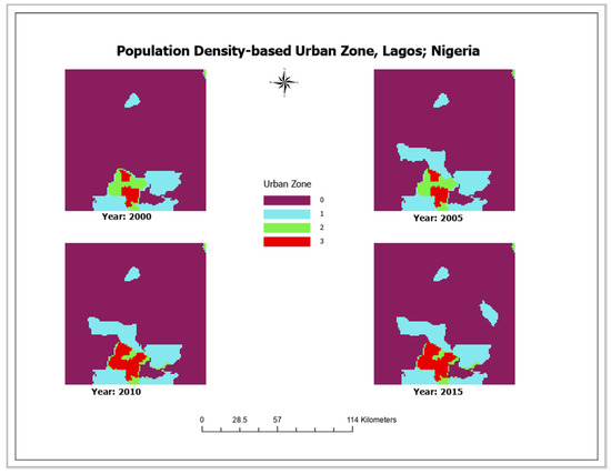 In the second stage of urban characterization, this study used available gridded population density data from 2000 to 2020, as detailed in the Data sub-section. The population density-based thresholds (Table 1) are found to be the best criteria for representing urbanization levels when gridded population density is considered. Similar to the zone classification for the DMSP-VIIRS nighttime light data, this urban characterization is based on population density and has four zones to represent the urban development intensity of the study area.