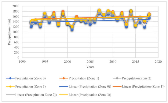The precipitation estimation based on the population density-based zone data shows that Zone 3 has a higher precipitation rate (slightly higher than Zone 1) than the other zones (Figure 8). Similar to the previous graph (Figure 6), Zone 2 demonstrated a higher increasing rate as evidenced by the steeper slope (Table 7). Also, Zone 0 has the lowest rate as was also the case when considering the nighttime light-based urban characterization.