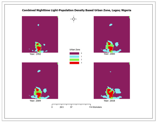 Finally, for a more robust and reliable urbanization characterization, both the nighttime light criteria and the population density-based criteria are combined for the corresponding zone (Table 1) and the same four zones with the same purposes of urban development representation were created.
