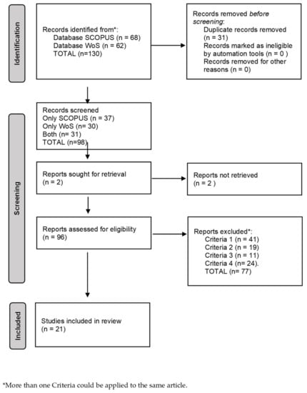 The selection process was registered on a flow diagram for new systematic reviews, based on PRISMA 2020 statements. As a result, from this process, 21 papers were finally selected (see