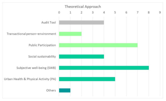 The four remaining theoretical approaches, Subjective Wellbeing, Social Sustainability, Physical Activity, and Audit Tools were distributed inside this framework according to their different strategies to assess citizens’ perception of their built environment. In general, Subjective Wellbeing (SWB) research is centered on upraising information regarding inhabitants’ self-reported wellbeing [