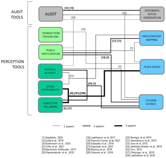 Perception Tools—perceived measurements (subjective approach): they involve self-reporting data on individuals’ perceptions of their environment. Indicators in this category include safety, aesthetics, or regular destination venues. In this approach, the indicators are generally qualitative since they always try to measure a subjective fact in itself, such as people’s perception or satisfaction.