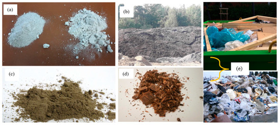 Industrial waste side streams used in this study: (a) fine and coarse fraction of flotation sand; (b) green liquor sludge; (c) paper mill power plant ash; (d) fiber waste; (e) mixed composition of materials in CDW.