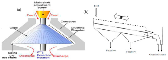 Machines selected for CDW pretreatments: (a) cone crusher [70]; (b) vibrating screen [71].