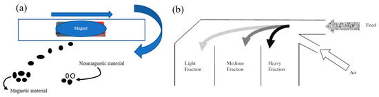 Techniques used for CDW pretreatments: (a) magnetic separation of material; (b) air classifier separation [71].