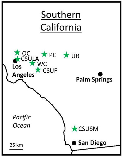 We measured rates of leaf litter decomposition and nitrogen (N) mineralization between 28 January and 17 May 2019, for two dominant native trees of the southern California region: coastal live oak (Quercus agrifolia Neé, hereafter “oak”) and western sycamore (Platanus racemosa L., hereafter “sycamore”) in natural and urbanized landcovers at seven college campuses in southern California (Figure 1, Table A1). These species were selected because they are typical of native woodlands and riparian forests, respectively, commonly found in sage scrub fragments, and are often used as landscape trees in urban greenspaces of southern California. Colleges were located along a ca. 150 km north–south and a 50 km east–west gradient, with Occidental College the northern- and westernmost college, CSU San Marcos the southernmost college, and the University of Redlands the easternmost college (Table A1). The average annual temperature ranged from 16.6 °C at Pomona College to 19.7 °C at Whittier College, and average annual rainfall was highest (451 mm) at CSU Los Angeles and lowest (332 mm) at CSU San Marcos. According to the UC Davis Soil Web (https://casoilresource.lawr.ucdavis.edu/gmap/; accessed 12 May 2022), soils at each site were Entisols; however, suborders varied between typic xerothents (CSU San Marcos, Whittier College, and Occidental College), typic xerofluents (Pomona College, CSU Los Angeles, and CSU Fullerton), and typic xeropsamments (University of Redlands).