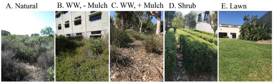 Pictures of the five landcover types at Pomona College in Claremont CA: (A) natural areas that have no water subsidies, but may include native sage scrub or a combination of native and non-native plants; (B) waterwise (WW) areas without added mulch. These habitats varied significantly among campuses, but were similar in that they were landscapes with water-tolerant plants to reduce water subsidies; (C) waterwise areas with mulch; (D) shrub areas with hedges and other, mostly non-native shrubs, are featured; (E) lawns. For a description of site characteristics for each habitat across the seven colleges, see Supplemental Table S1.