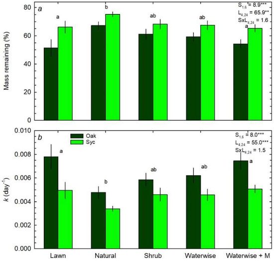 Mean (±se; n = 7) percentage of initial mass remaining (a) and the mass loss rate constant (k) (b) from decomposing oak (dark-green bars) and sycamore (light-green bars) leaves. Shown also are the results of a 2-way ANOVA (F-statistic, degrees of freedom, and p-value) with leaf substrate (S) and landcover type (L) as fixed effects and the substrate x landcover (S × L) interaction. In the event of a significant ANOVA for site, a Tukey–Kramer post hoc test was run to see which landcovers were significantly different. Means with different letters are significantly different. ** p < 0.01; *** p < 0.001.
