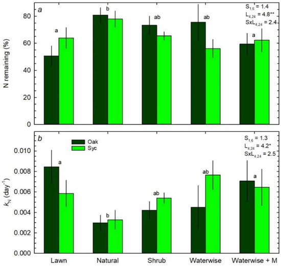 Mean (±se; n = 7) percentage of initial litter N remaining (a) and the N mineralization rate constant (b) from decomposing oak (dark-green bars) and sycamore (light-green bars) leaves. Shown also are the results of a 2-way ANOVA (F-statistic, degrees of freedom, and p-value) with species (S) and habitat (H) as fixed effects and the species x habitat interaction. In the event of a significant ANOVA for site, a Tukey–Kramer post hoc test was run to see which sites were significantly different. Means with different letters are significantly different. * p < 0.05; ** p < 0.01.