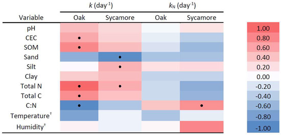The k for sycamore leaves was positively correlated with silt and total N content and negatively correlated with sand content (Figure 5). The oak k value increased as soil CEC, SOM, total N, and total C content increased and declined as the soil C:N ratio increased. Oak litter kN was not significantly correlated with any of the soil variables, while the sycamore kN was significantly correlated with the soil C:N ratio (Figure 5). Variations in soil temperature and humidity in the upper 0–10 cm soil layer between the different landcover types did not influence the decomposition and mineralization rates in any consistent manner (Figure 5).