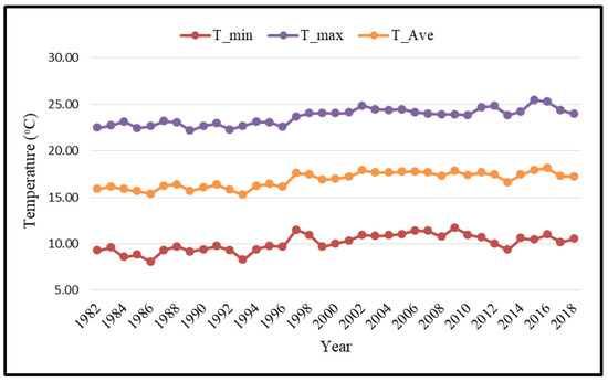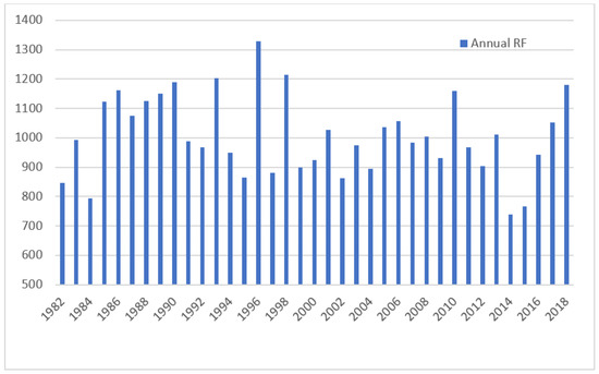 Addis Ababa has a subtropical highland climate. The city has a mix of highland climate zones, with average temperature differences of up to 12.2 °C, depending on elevation and prevailing wind patterns (Bureau of Finance and Economic Development of Addis Ababa, 2013). Figure 2 shows the climate data of Addis Ababa, which are analysed on the basis of temperature and rainfall data. The analysis was conducted with 36 years (1982–2018) of data from 56 stations obtained from Addis Ababa Observatory [77]. Data were segmented into three periods’ averages, and the magnitude of change in temperature within the last 36 years was computed. The analysis shows that both maximum and minimum temperature is increasing. The average maximum temperature from 1982 to 1992 was 23.1 °C, while from 1992 to 2002, the average maximum temperature was 24.0 °C. From 2002 to 2012, the average maximum temperature increased to 24.8 °C. Finally, from 2012 to 2018 the average maximum temperature increased to 25.5 °C. This shows that the rate of change in recent years is greater, and the temperature has increased faster over the last two decades than during the previous decade. Furthermore, the average minimum temperature increased from 9.7 °C in the period from 1962 to 1992 to 10.9 °C for the period from 1992 to 2002 and to 11.7 °C for the period from 2002 to 2012 (Figure 2). Mean annual rainfall distribution over the city for the last 36 years was characterized by three months of heavy rainfall each year with long and dry periods. The average annual rainfall at the Addis Ababa observatory station from 1982 to 2000 was 1036 mm, while the average mean value from 2000 to 2018 was 935 mm. Although the average rainfall did not show a significant change, it did show significant variability within each decade (Figure 3) [77].