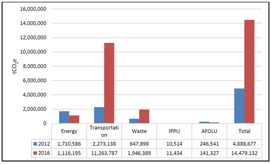 The 2016 Addis Ababa GHG inventory enables a comparison to be made with the previous emissions inventory, compiled in 2012. An emission trend summarized in Figure 3 has shown an increase in total GHG emissions in the city over this period. Greenhouse gas in Addis Ababa emitted 14.48 million tonnes CO2e (14,479,133 tCO2e) in 2016. This estimation covers the energy, transport, and waste sectors. The transport sector was found to be the highest emitter, accounting for 78% of the total emissions, followed by the waste sector at 13% and the stationary energy sector at 8%. An analysis of Addis Ababa’s GHG emissions in 2016 indicated a ~3 times increase in emissions compared with the first emissions inventory, prepared in 2012. The growth has been attributed to the rise in emissions from the transport by 8,990,649 tCO2e due to more fuel being consumed and existence of old vehicles. Emissions from waste are around 1,298,491 tCO2e higher in 2016 than 2012 due to a reduction in total waste arising sent to landfill and an increase in composting. Whereas the source from the stationery energy has been reduced dramatically by 594,391 tCO2e; this is due to improvements in generation efficiency and electricity consumption by residents. At the same time, emissions from AFOLU are around 105,214 tCO2e lower in 2016 than 2012 due to a reduction in total number of livestock and minimum application of fertilizer (Figure 4) [62]. This indicates that the Green House Gas emissions of the city in an increasing trend.