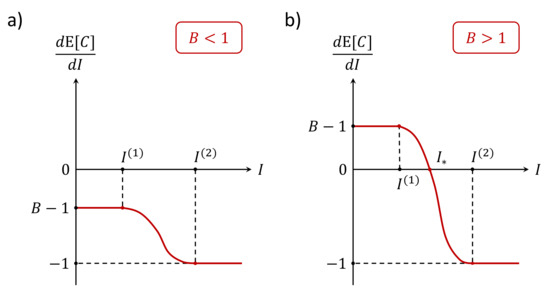 If (Figure 3b), the derivative is initially positive, then it starts decreasing and eventually becomes negative. This means that initially increases with I, but then starts decreasing. The point where the derivative is equal to zero corresponds to a maximum of . This point corresponds to the solution of Equation (15). However, we should also take into account the budget constraint (Equation (2)). So, we should choose either or, in case does not satisfy the budget constraint, the maximum possible investment compatible with the budget constraint, . Overall, this yields Equation (14).