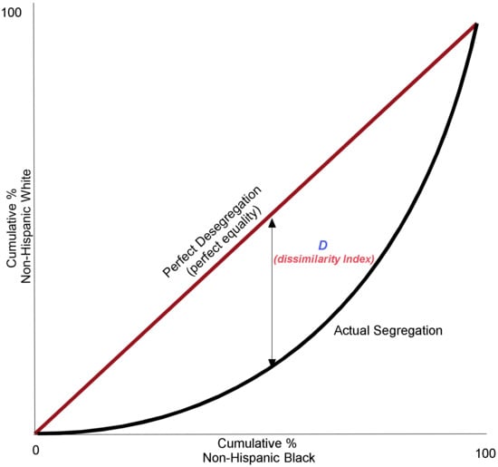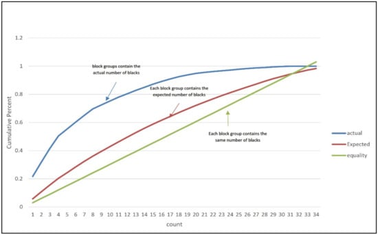 As the first step, the school of thought must be established. The schools split on the base of comparison. The first school, the most common, is to define segregation as a relationship of the actual distribution to that of the Lorenz curve, or cumulative percent curve. This school defines perfect integration (zero segregation) as each sub-area containing the same percentage of a minority as the larger area. Segregation is thus the deviation from complete desegregation or equality. Ultimately these are tied to the Gini Index [39,40]. Most studies of segregation use this operational definition and approach to segregation implicitly but not explicitly (Figure 3).