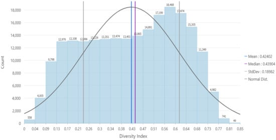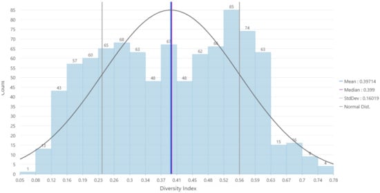 There are several measurements of diversity available [8,31,32,33]. Nevertheless, the most used diversity index in social and population studies is the Simpson Index, often known as the Diversity Index (DI). The Census Bureau uses this index on its web pages and diversity reports [34,35,36,37]. Environmental Systems Research Institute (ESRI) has also used the Simpson Index in its diversity coverage [38].