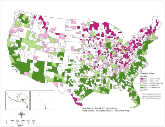- Esri Diversity Index: Growth in Diversity from 2000 to 2021. Available online: https://arcgis-content.maps.arcgis.com/apps/MapSeries/index.html?appid=a1803e6409a64f1cb4f0937bdd27a0ba#. (accessed on 23 November 2021).