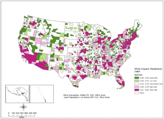 - The Hispanic isolation indices were slightly higher with a median of 0.114, ranging between 0.009 and 0.997. This was the largest range of values for any racial group. Metropolitan areas had higher indices (median = 0.150) than micropolitan areas (median = 0.084). The higher Hispanic isolation indices were geographically concentrated on the west coast and the Southwest, though Florida and the northeast coastal areas registered high values. Eight of the areas with the highest isolation indices were in Texas. All ten were found along the Mexican border. The west coast, particularly California, displayed the most areas with a substantial overlap of white-Hispanic dissimilarity and Hispanic isolation.