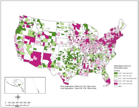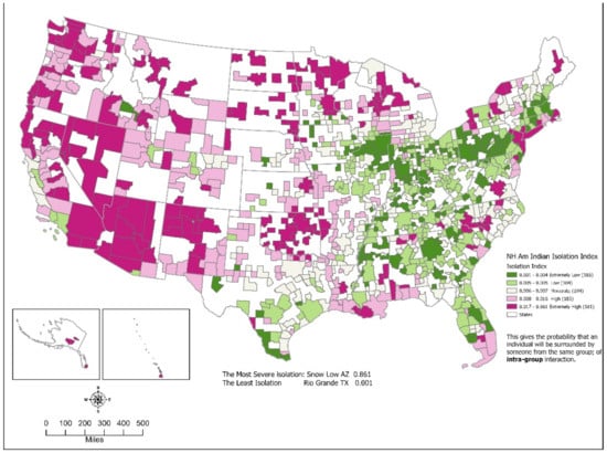 - Native American isolation indices were among the lowest. The median index was 0.006, ranging from a low of 0.001 to a high of 0.861. Metropolitan and micropolitan areas had basically the same median index, 0.006 and 0.005, respectively. Geographically, the highest Native American isolation indices were found in the West but were also clustered in the north-central states along the Canadian border, Oklahoma, North Carolina, and New York. These areas are the locations of reservations and traditional and historical tribal regions. Nine of the ten highest areas were in Arizona and New Mexico, with the other area being in New York. Oklahoma again was an anomaly, with relatively high Native American isolation indices while having relatively low dissimilarity indices. Several metro/micro areas in Arizona and New Mexico had significant overlap between Native American-white dissimilarity indices and the isolation indices. In these areas, Native Americans were not only clumped together, but they also had a high probability of only interacting with other Native Americans.