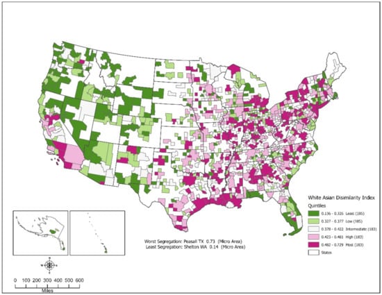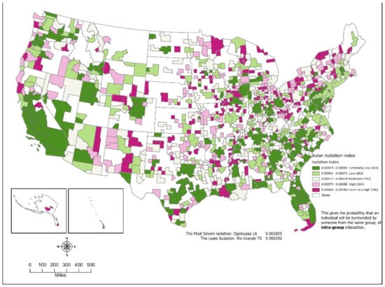 - Asian isolation was exceptionally low. The median was 0.001. Isolation was highest in the Great-lake region, the Rustbelt and the northern Midwest, and the pacific northwest. California had several areas with high isolation. The South and most of the Southwest had displayed the least Asian isolation.