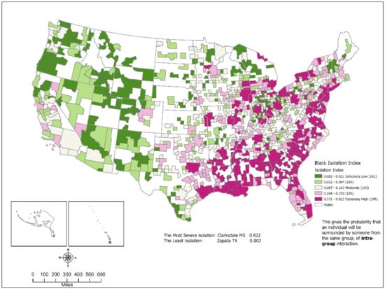 - The black isolation index had a median of 0.104, varying from a low of 0.002 to a high of 0.822. Areas with high indices were concentrated in the eastern half of the country. The metropolitan areas had higher indices than the micropolitan areas (medians of 0.192 and 0.063, respectively). All ten areas with the highest indices were in the South, and five were in Mississippi. The lowest indices were found in the western half of the country. There was a substantial overlap between Black-white residential segregation and black isolation. So, blacks were not only clumped together across the areas but were also isolated into the same block groups they would thus have more interaction and contact with other blacks.