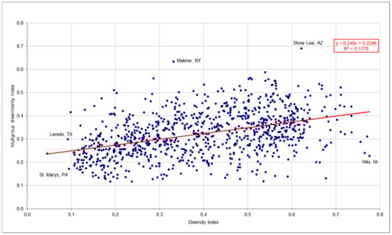 - The racial diversity index was significantly related to the multigroup dissimilarity index as hypothesized (H1). The correlation coefficient was 0.422 with a slope of 0.249. As racial diversity increases within the metro/micro areas, so does the overall racial residential segregation amongst the eight racial groups.