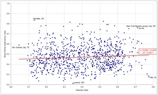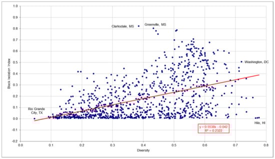 - In contrast to diversity and the Black-white dissimilarity index, urban racial diversity and black isolation were significantly related. The relationship was linear, and the correlation coefficient was 0.482 with a slope of 0.554. Hypothesis H3 was confirmed for this group. The greater the racial diversity of the metro/micro areas, the greater the isolation of blacks.