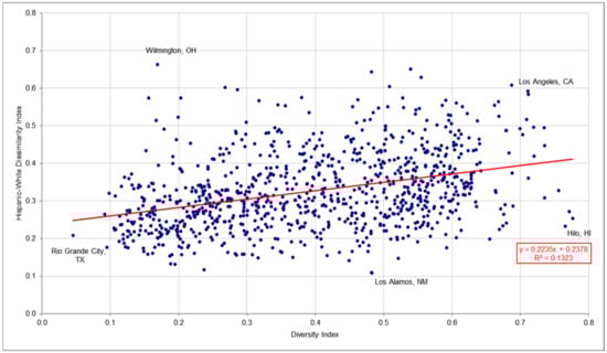 - Racial diversity and the Hispanic-white dissimilarity index were significantly related. The hypothesis (H2) of the relationship was strongly supported for this racial group. The correlation coefficient was 0.364, and the slope was 0.224. The connection was linear.