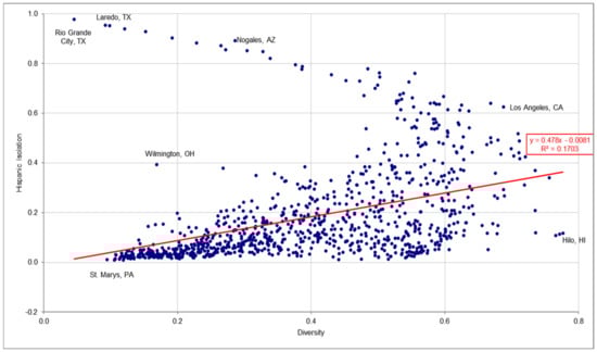 - Racial diversity was also found to be significantly related to Hispanic isolation. The relationship was linear, with a correlation coefficient of 0.413 and a slope of 0.478. for Hispanics, hypothesis H3 was strongly supported. Here, too, the greater the urban racial diversity, the greater the isolation of Hispanics.
