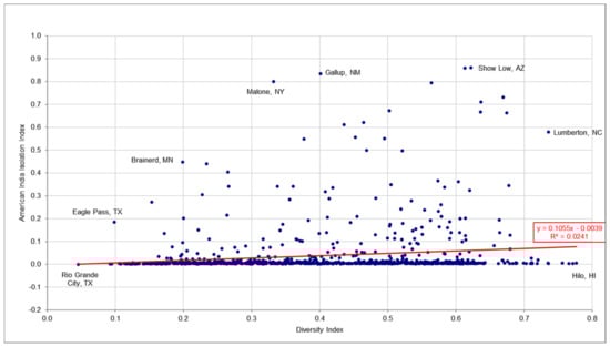 - For Native Americans, urban racial diversity was not significantly related to Native American isolation. What relationship existed was weak, so H3 was only weakly supported. It was linear, the correlation coefficient was 0.155, and the slope was 0.1055.
