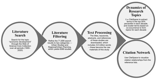 Data are collected through the following procedure, which is similar to the standard practice in the literature [24]. I searched for the topic “economic development” in the Web of Science Core Collection over all periods (1900–2020). This search returned a collection of 71,699 studies, whose title, keywords, or abstracts is related to economic development. The earliest publication date of these studies is 1959. However, these studies are from a massive variety of different fields, making the review incoherent. Thus, I further refined the categories of studies to those that are in the urban or regional contexts, which include two categories in the Web of Science database—Urban Studies (2892 studies) and Regional/Urban Planning (4764 studies). This is sensible as the field of Urban Studies includes studies on urban economic development, while the field Regional/Urban Planning includes regional development as well as economic development as a one of the major subfields of urban planning. This yielded a total of 6589 studies because one article can fall into multiple categories. These studies and their titles, keywords, abstracts, and references become the raw materials for this paper’s bibliographic analysis, which includes 3.8 million words. The large number of texts in this collection makes it more suitable for a text mining analysis than a human read.