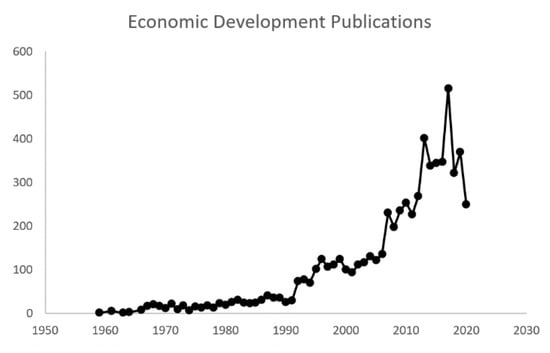 The number of economic development publications has increased drastically over time (Figure 2). The surging number of publications makes a systematic review more useful for researchers to effectively grasp what has been studied and how the research topics have evolved. These articles come from a variety of journal outlets, including Regional Studies, Urban Studies, Economic Development Quarterly, European Planning Studies, Growth and Change, Journal of Developing Areas, Cities, and Urban Affairs Review.