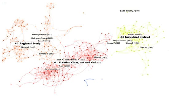 The citation networks among articles, journals, and institutions, and countries have also shown interesting patterns. Three major citation clusters among papers emerge. The largest citation cluster titled “creative class, art and culture” centers around Florida (2002) [33], following by a second-largest cluster titled “regional study”, with McCann and Ortega-Argilés (2015) [41], Barca et al. (2012) [39], Rodríguez-Pose (2013) [40] and Spigel (2017) [42] being the most cited articles. A third citation cluster forms around Morgan (1997) [43] and Porter (1998) [44] to engage with the topic “industrial district”.