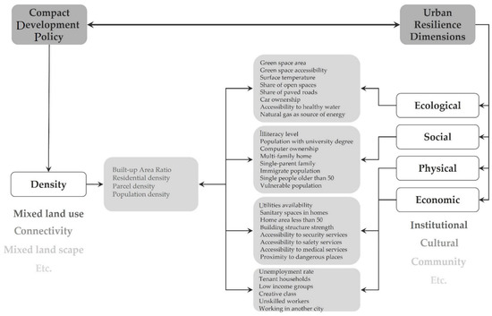 - Dehghani, A.; Alidadi, M.; Sharifi, A. Compact Development Policy and Urban Resilience: A Critical Review. Sustainability 2022, 14, 11798. [Google Scholar] [CrossRef]