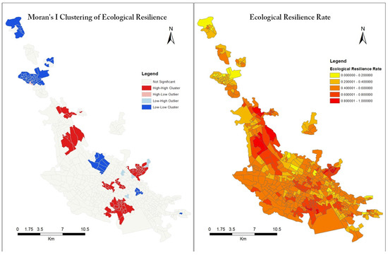 From a cross-sectional perspective, as revealed in Figure 3, the ecological resilience value has a heterogeneous pattern. The value of ecological resilience has normalized between 0 and 1 to rank all zones. A cluster analysis, presented in Figure 3, shows that ecological resilience in some parts of the city is concentrated. However, this pattern is not necessarily based on the social north and south of the city. The southern and some north-center zones of the city have the highest ecological resilience. The main reason might be the higher share of green and open spaces in these zones. On the other hand, some cold spots of ecological resilience were detected in the central and northern zones. While the former is a historical zone of the city and has a deficient level of open and green spaces, the latter has mainly a rural–urban landscape.