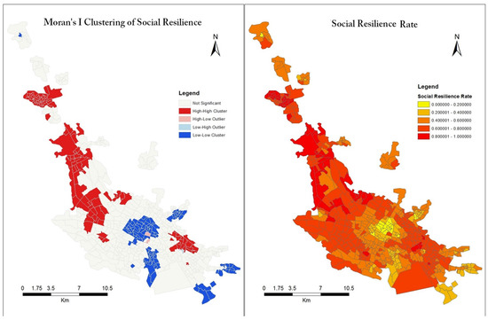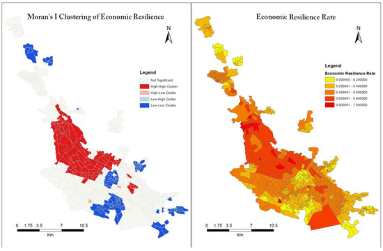 where xi is the real value of indicator j; and , xmax, and xmin are the average value, maximum and minimum observation of indicator j, respectively. This conversion system makes the value of all indicators comparable to a system with the same unit. The sum of values in each row for each factor (for example, ecological) would be the value of that zone in ecological, social, economic, and physical resilience. Also, as this research compares urban resilience indicators and their distribution throughout the space, we have applied a clustering analysis to detect the hot spots of the high and low values of urban resilience indicators in each dimension. The concentration and distribution of urban resilience in each dimension are analyzed by the spatial autocorrelation method of Moran’s I (Local Indicators of Spatial Autocorrelation [LISA]). The function of this model is shown below: