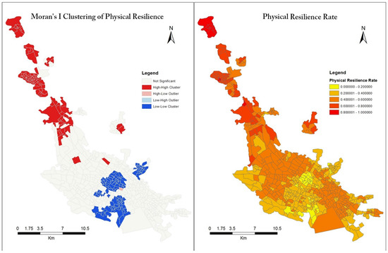The spatial variation of physical resilience in all zones is presented in Figure 6. Based on the selected indicators, there is a clear segregation pattern in the distribution of physical resilience. Northern parts of the city have the highest level of physical resilience. Conversely, the central parts of the city, mainly including historical areas and peripheral areas of southern zones, have the lowest level of physical resilience. The clustering analysis also shows the concentration of more resilient zones in the city’s north. In contrast, the center and south of the city have low physical resilience levels.