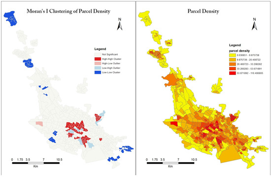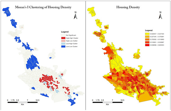 Figure 7 shows that the population density in the central areas is higher than in the northern and peripheral zones. The concentration of hot spots is not considerable, but cold spots of population density value could be detected in the north of the city, specifically in the outer rings. Housing density has a similar pattern, as shown in Figure 8. But it is worth mentioning that high housing-density zones are significantly concentrated in the central zones. As one of the most common forms of densification used in previous studies, the built-up area ratio has a very different distribution pattern than other types of densification representation (see Figure 9). While the central and southern parts of the city have a low level of BAR, the hot spots of this variable have been detected in different parts of the city, albeit with a higher concentration in northern areas. Additionally, parcel density, as a novel indicator of density, unlike other variables, has a significant concentration in central zones, specifically the historical districts (Figure 10).