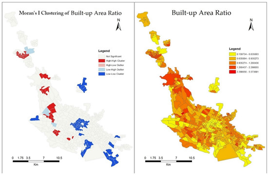 where Di, pi, and si are density, population, and area of zone i, respectively. On the other hand, we have used the built-up density called BAR (built-up area ratio). This indicator shows the intensity of land used for buildings in a specific zone. It is calculated based on Equation (4):