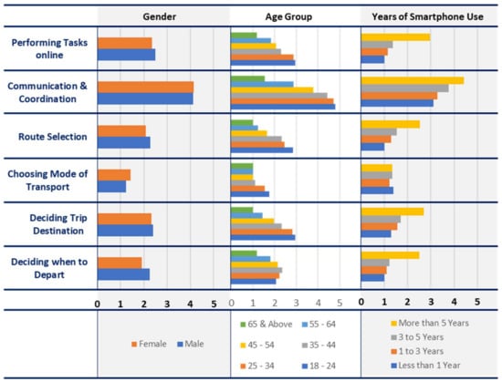 The pattern of use of smartphone apps for trip planning purposes by various user groups based on personal level attributes is shown in Figure 1.