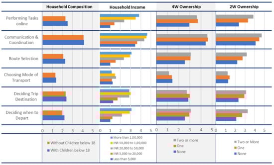 At the household level, it was observed that the dependence on smartphone apps had not been affected by the presence of children under 18 years in households in Bhopal, except for the purpose of deciding when to depart for various activities on a daily basis, considering the routine or children’s schedule. The dependence on app usage by respondents from high-income households was observed to be higher for all purposes and steadily decreased for lower-income households, which is consistent with previous studies [11,28,29]. Although the dependence on smartphone apps for choosing a mode of transport was found to be the least of all purposes, it was observed that the users of medium-income households had a relatively higher app usage for the same. Surprisingly, unlike the research evidence [13], apart from the purpose of choosing a mode of transport, households that did not own a vehicle showed a lower dependence on app usage and vice-versa. It was observed that users among families with at least one private car appeared to demonstrate more reliance on smartphone applications for various trip planning purposes.