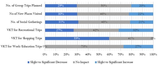 A significantly large share of respondents stated no changes in VKT for recreational trips. Among those who reported a change, most of the younger respondents reported a slight to significant increase. However, as age increased, more and more users stated that the number of recreation trips decreased. Users with less experience with smartphones reported a decrease and vice-versa. As income increased, a larger share of respondents stated an increase in VKT, rather than a decrease. A similar finding was observed in the case of vehicle ownership.
