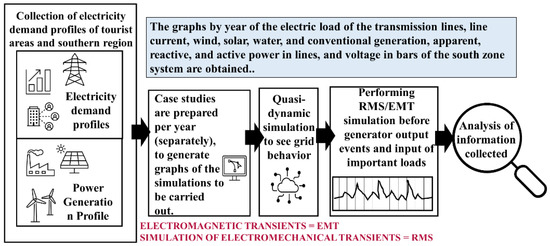 Quasi-dynamic and RMS/EMT simulations were then performed in DIgSILENT. Quasi-dynamic simulation works well for planning studies where long-term load and generation profiles are established, and where grid evolution is modeled using variations and expansion stages [16]. The quasi-dynamic simulations were used to model the system’s development during the analysis period, measuring variables such as line currents; line load; solar, wind, hydro, and conventional energy generation; and active, reactive, and apparent power in lines [17]. Regarding the RMS/EMT simulations, they were used to observe the system’s behavior in the following situations: output of a generator with the capacity to activate the load shedding system, and input of the most significant load in a bus of the system. The bus bars’ electrical frequency and voltage behavior were measured to validate whether they were within the stability margins. Finally, the results were analyzed, describing the behaviors in the simulations, and their relevance was verified in terms of the adverse effects that they could produce on the electrical power system. Figure 1 shows the methodology used for the study.