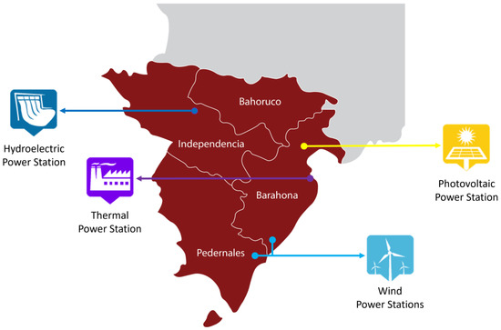 The Enriquillo Region is in the southwestern area of the Dominican Republic, formed by the provinces of Barahona, Pedernales, Independencia, and Bahoruco. The area occupied by these four provinces is 6961.43 km2. The Enriquillo Region has five wind generation plants in two of its four areas: Barahona and Pedernales. Barahona has three plants, with a total installed capacity of 149.80 MW. At the same time, Pedernales has two plants, with a total installed capacity of 33.45 MW. Additionally, Barahona has a photovoltaic generation plant with an installed capacity of 25 MW, a thermal generation plant with an installed capacity of 51.80 MW, and a hydroelectric generation plant with an installed capacity of 7.50 MW (see Figure 2).