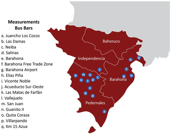 The bus bar measurements of the electrical power flow of the southern zone are presented in Figure 3. In addition to considering the measurement points mentioned above, the measurement points of the tourist areas located in the eastern and northern parts of the country were considered as a reference for the impact on electricity demand caused by tourist areas, such as Guavaberry, Juan Dolio, Sosua, Cabarete, and Las Americas Airport.