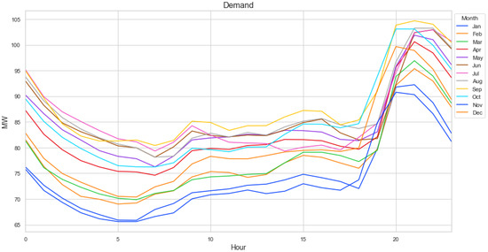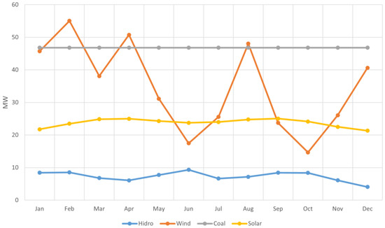 Figure 5 shows the average monthly demand registered in the southern zone for 2020, while Figure 6 shows the generation curves by source for the same area and year. Figure 6 shows the system’s time demand; this peak is presented from the 20th hour. In contrast, photovoltaic solar generation presents its generation peak at 12–14 h. This difference is a challenge for the electrical system that could limit renewable generation. These data were essential for the simulation and scenarios presented in the Section 5.