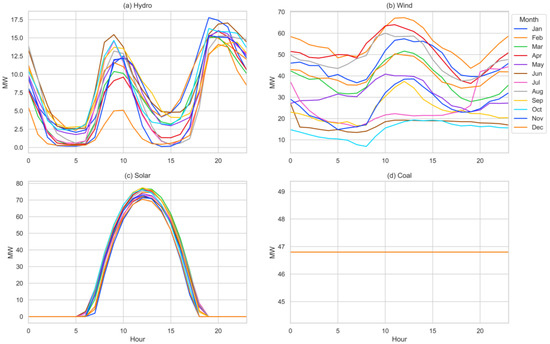Generation curves by source: (a) hydro; (b) wind; (c) solar photovoltaic; (d) coal power plant.